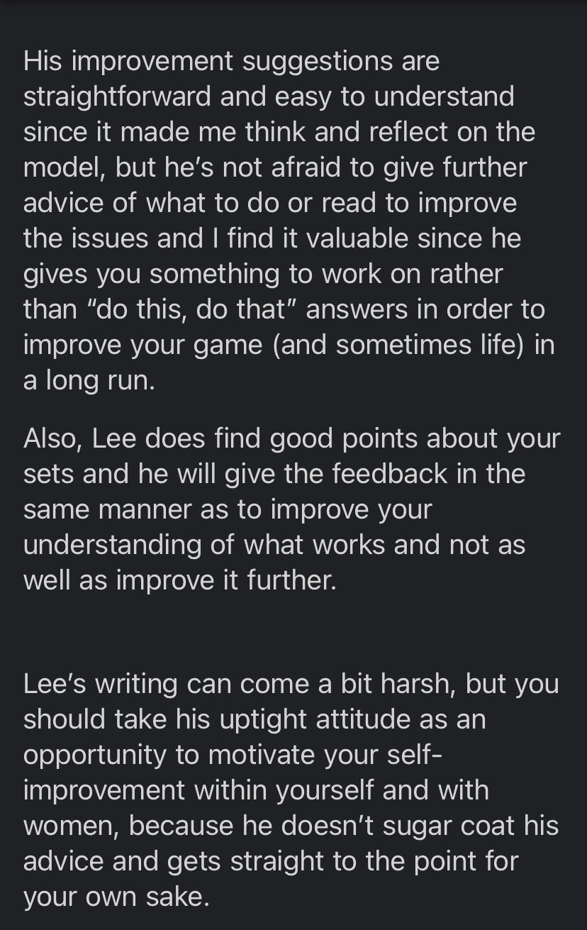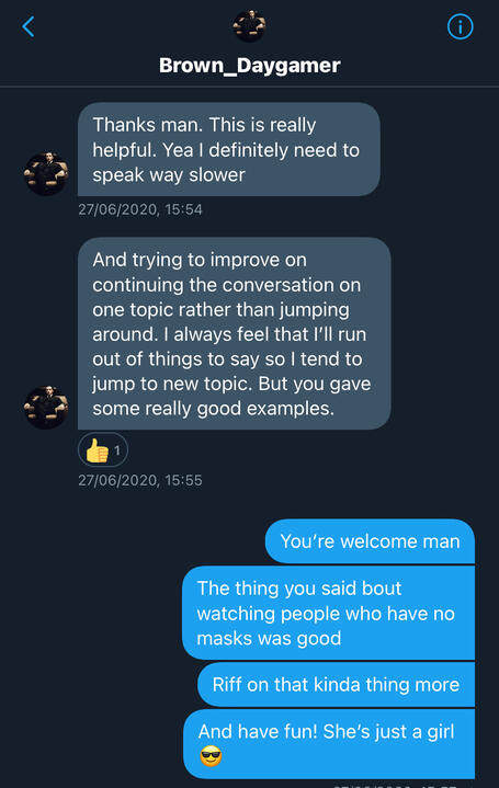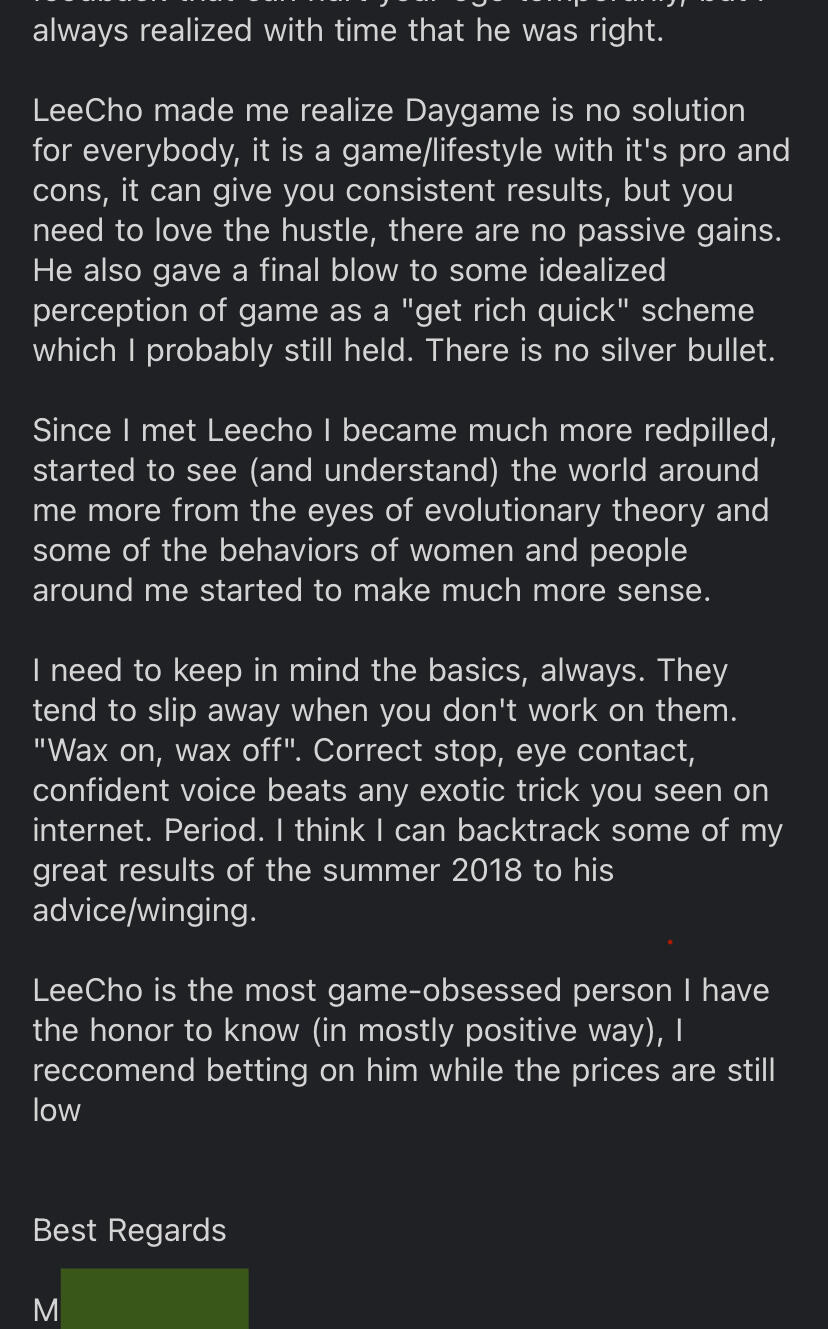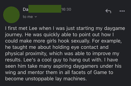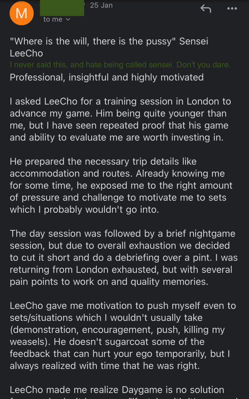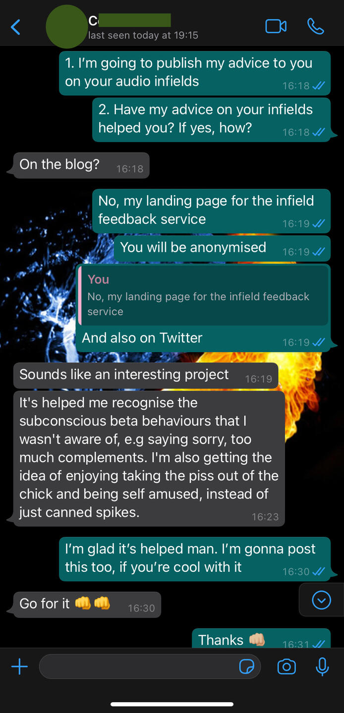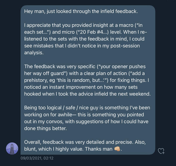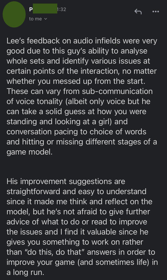 I will analyse your infield recordings and give you bespoke recommendations to make your daygame better.